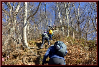 ![]() < クサリ場→山頂ショット←→沢を横断> |