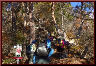 クサリ場を敬遠し対象にしなかったが 長野県カルチャーセンター里山を楽しもう! 講座、過去の山行記録に無く安全第一を窺え るが下見でも傾斜が緩く岩登りの基本に忠実 なら問題無しと判断し選択。普通車なら神社 手前まで舗装道路で行けるが、マイクロバス では下見の使ったルートしか無理。国道を走 っていると里山の景色は茶色が目立ち、既に 紅葉の見頃は過ぎたものと期待薄。と思った が実際に山中に入り、特に陽射しのある場所 ではまだ充分に見応えのある紅葉や黄葉が残 っていた。楽観していたクサリ場もパーティ ー多く通過に時間は要すが、織り込み済み。 最後の講座となってしまったが、山姥の滝は 皆さん希望せず観音堂へと無事下山♪ 画像レポはこちら |