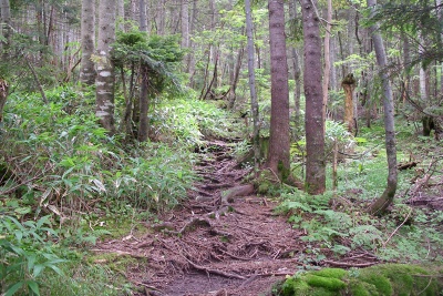 ![]() やっと地面が・・ 樹林帯の登りだけが熊笹から解放される |