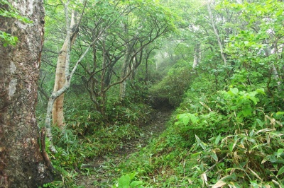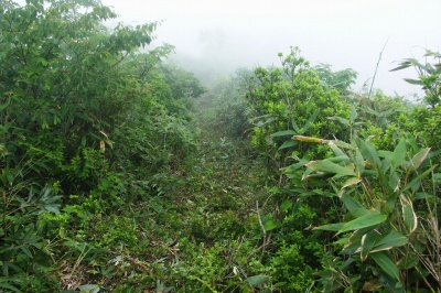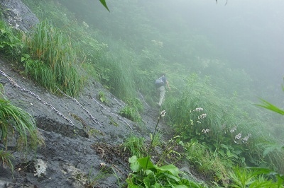 ![]() 急下降 上部はクマザサで濡れて滑りやすい |