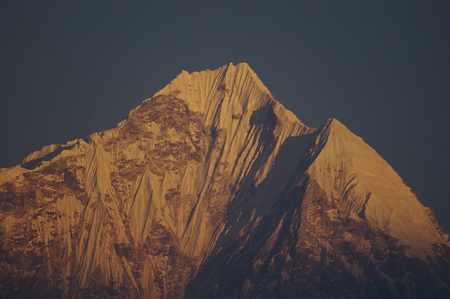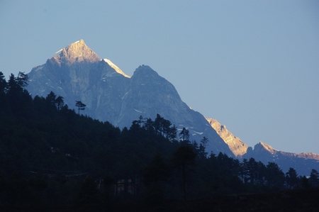 ![]() パグディンの夜明け ヌプラ(6959m)?手前の鋭峰に陽が射す |