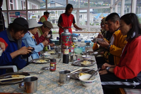 ![]() 昼食メニュー 味噌汁とトレーに盛られたシェルパ料理 |