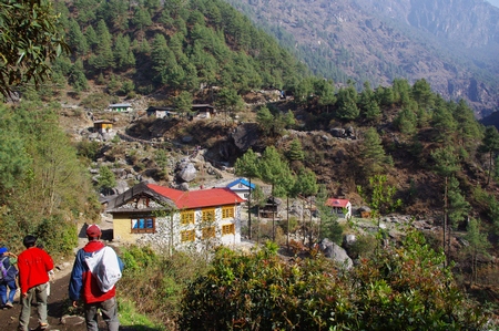 ![]() ロッヂ前にて ナムチェの佇まいとタムセルク |