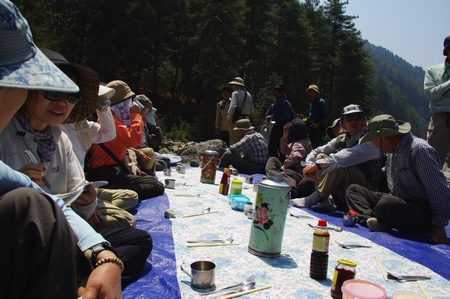 ![]() 昼食 河原の一角にブルーシートが敷かれ準備済み |