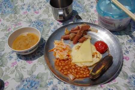 ![]() 朝食 味噌汁にナン+目玉焼き |