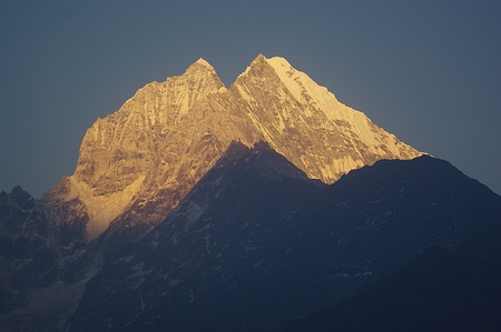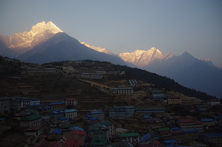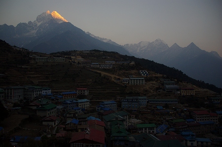 ![]() 暮れゆくナムチェ 落日は徐々に高峰へと照射を移す |