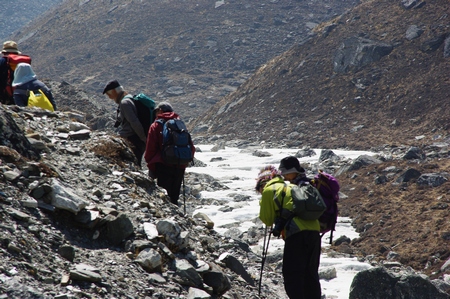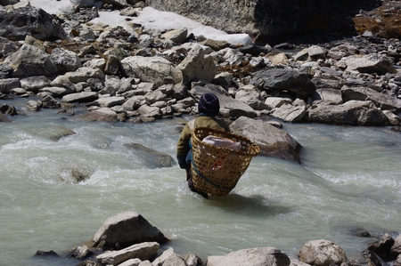 ![]() 冷たい流れも何のその シェルパが止めるのも聞かず河を渡る少年 |