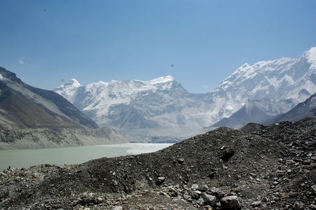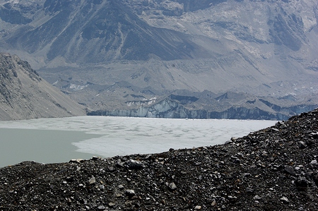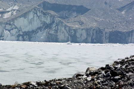 ![]() モレーン末端近く 中の氷が溶ければダム機能は弱まる |