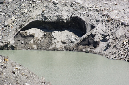 ![]() モレーン中の氷が融け湖水の流出口に変わる |