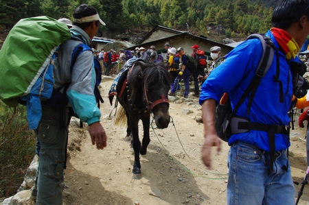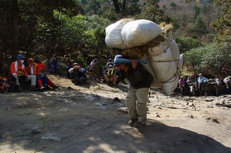 ![]() 後からヤクの餌を背負ったポーターが続く妙 |