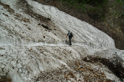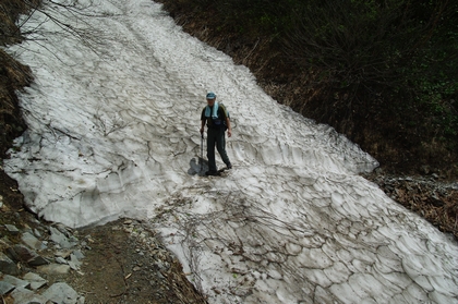 ![]() 残雪トラバース中に下方を覗くと・・ |