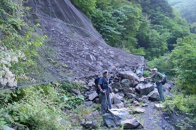 ![]() 法面崩落 防護ネットを破った岩石 |