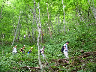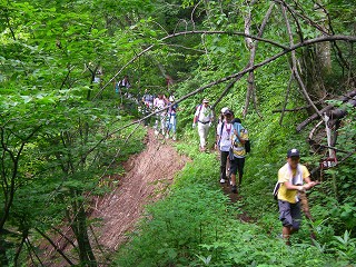 ![]() ようやく沢筋へ -11:49 滑落防止にザイル使用の悪場も |