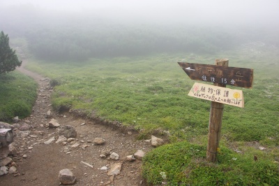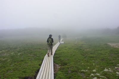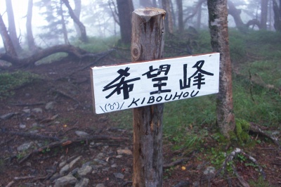 ![]() 霧の稜線を希望峰へ向かう お二人は北岳から入山し一週間の縦走!! |